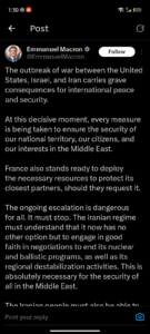 In a statement shared on X (formerly Twitter, Macron described the conflict as the start of a war and carrying “grave consequences for international peace and security,” called the escalation “dangerous” and urged it to stop, while pressing Iran to negotiate an end to its nuclear and ballistic missile programs.